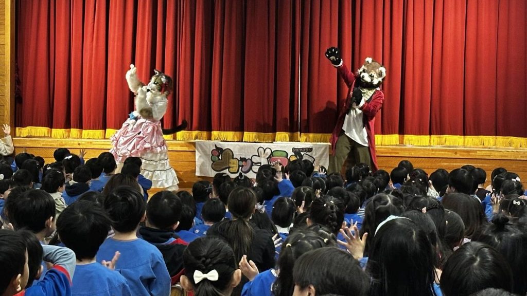 → 何名からでも対応可能です。会場条件に応じてご提案いたします。(人形劇として着ぐるみキャラクターは等身大なので小さくて見づらいということがなく、大きなホールでも鑑賞が可能です)